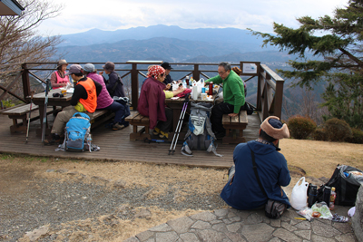 | ロープに掴まってがんばる。 | 葛城山山頂で昼食タイム。(Iさん撮影) |