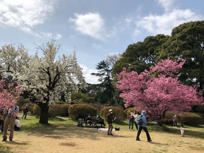 | 色とりどりの園内を歩く | 木陰で小休止 |