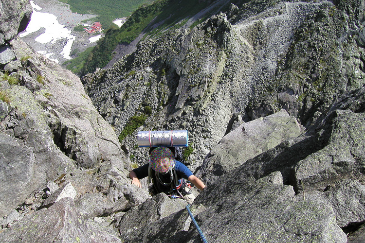 前穂北尾根3峰上部の凹角を登る(左上に涸沢ヒュッテが見える、右上が4峰方面)(2003-8/3撮影)