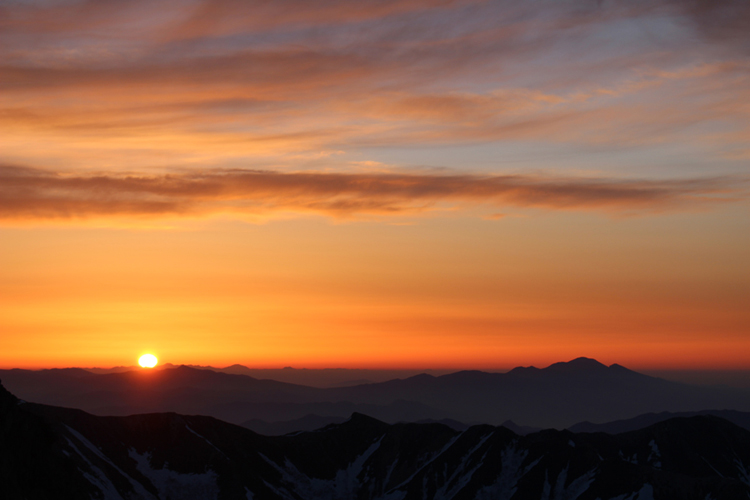 槍ヶ岳山荘から見た御来光と浅間山(2018-4/30 槍ヶ岳で撮影)